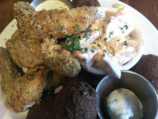 Fried catfish with Hushpuppies and the most amazing potato salad...it was super spicy and I loved it!