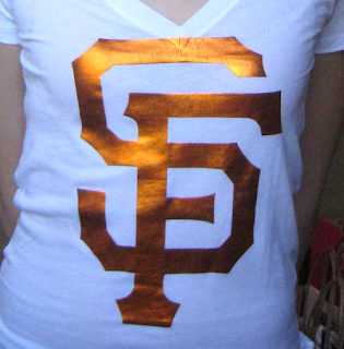 The only real difference between the two is the v-neck on the Giants shirt and scoop neck on the Niner shirt. Both shirts are of excellent quality, with beautiful contrast pipe stitching around the collar, made with a great fabric that's not too thin. Definitely sturdy enough to roll around in the grass for a while with, or survive a few beer spills. My camera doesn't do the Giants orange foil justice (it looks too dark in all my pictures), but the foil print on both shirts are also awesome, they're bright and shiny in person--just the way I wanted it!